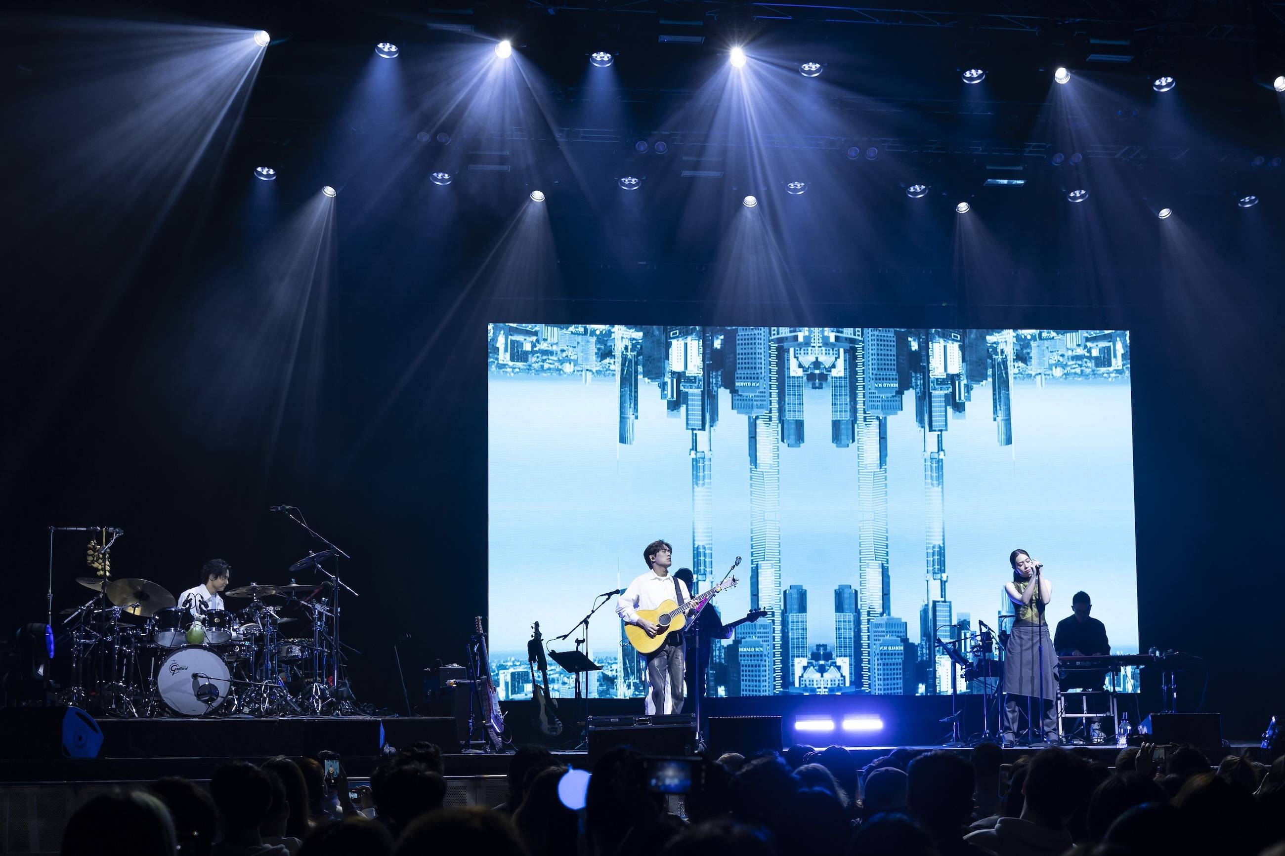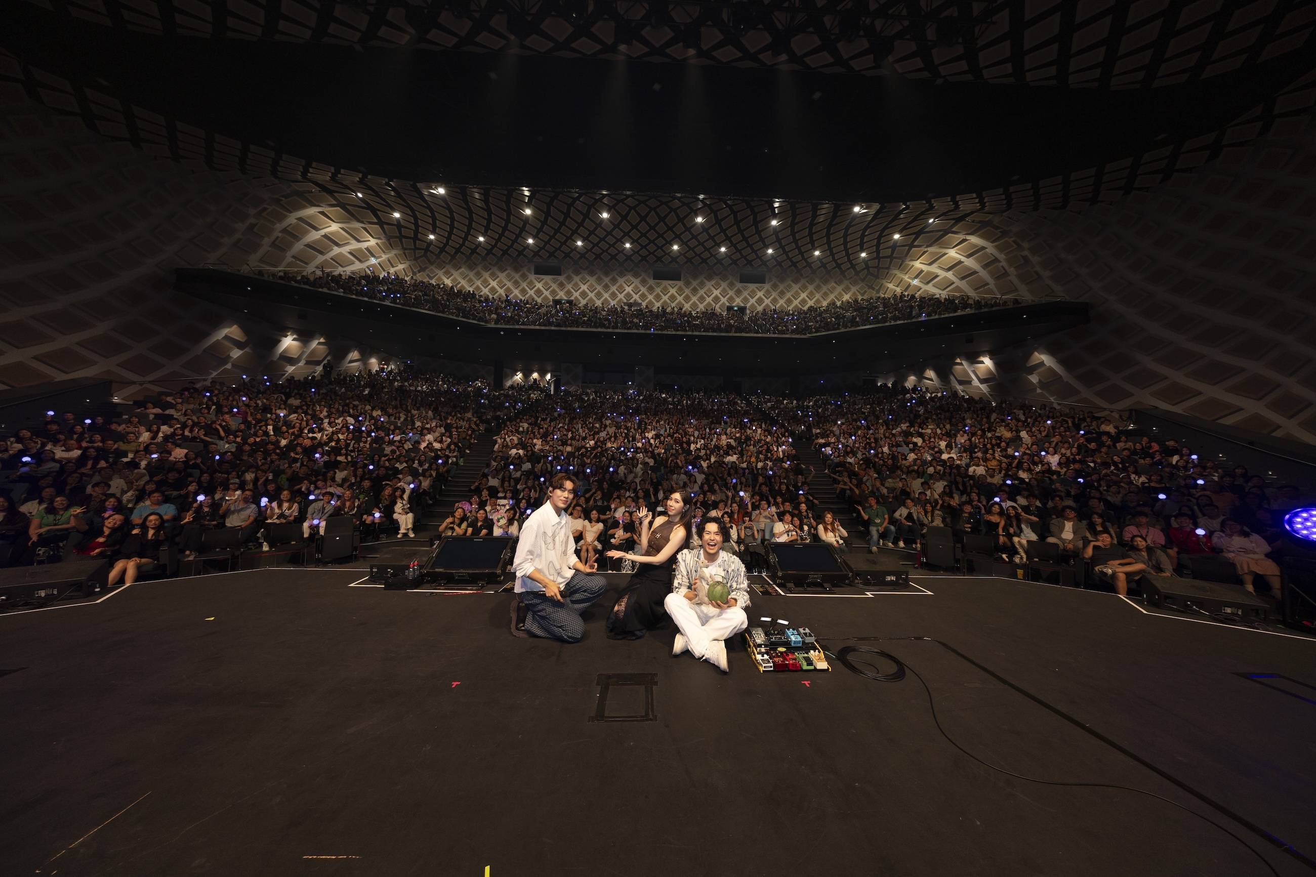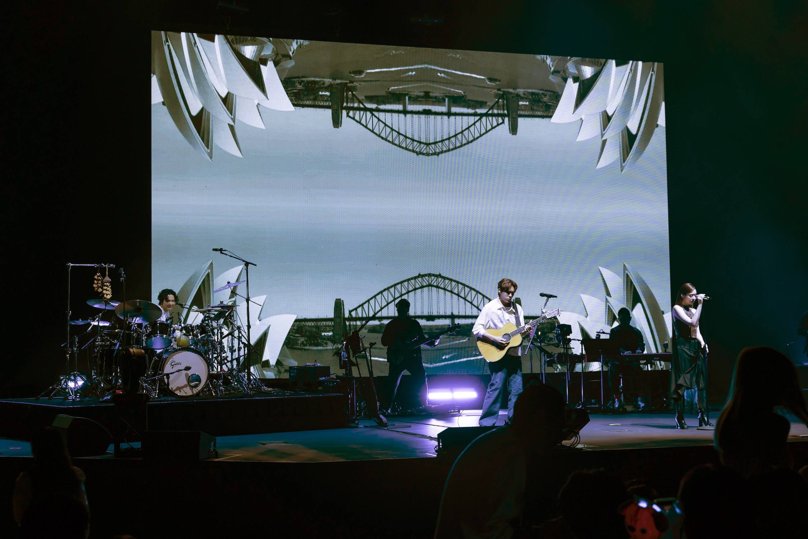 这趟巡演也是告五人在农历春节 “充满电” 后开启的首轮巡回演出,距离上一次来澳洲已经时隔两年,三人对再次和当地歌迷见面格外期待。告五人分享:“上次来感受到大家满满的热情,第二次见面,这次 Live House 距离更近,很开心。我们在澳洲待了一周,很喜欢这里的生活,很 chill!” 台下歌迷立刻大喊要告五人 “留下来”,甚至有人开玩笑说:“住我家!” 让全场笑声不断。回忆上一次澳洲之行,他们也打趣道:“印象很深的是大家好像睡得很早,但这次我们准备了很多歌,要带大家一起找夜生活!” 舞台上也藏有澳洲限定小巧思,不仅视频画面出现墨尔本、悉尼的城市风貌,鼓手哲谦还特地把袋鼠玩偶放在鼓组上,为澳洲场增添专属纪念。